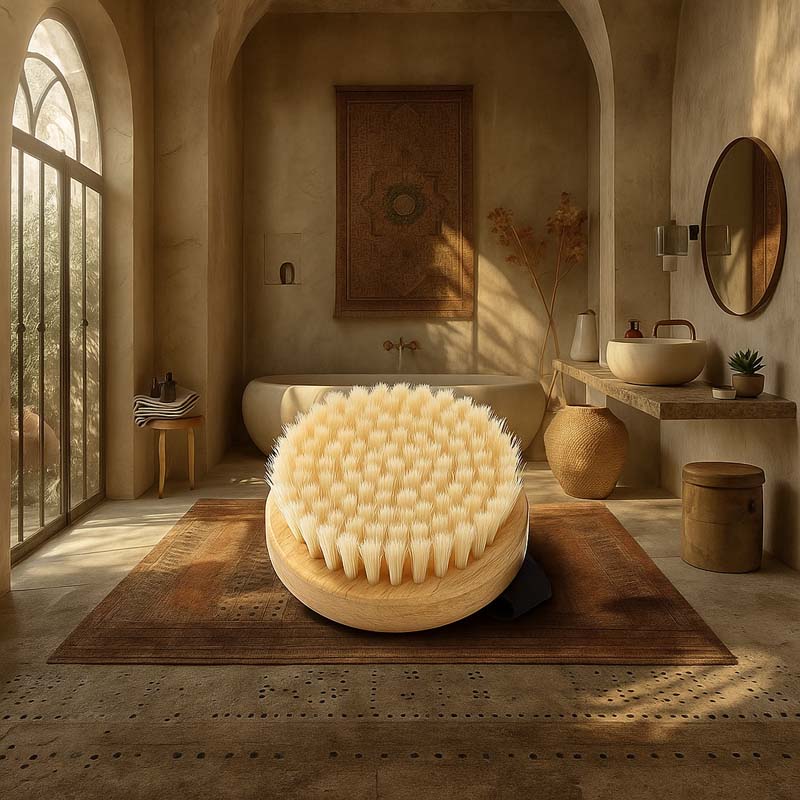 DRY BRUSH. Βούρτσα μασάζ, στρογγυλή, οξιά, τρίχα από χοιρίνι, διάμετρος 10 εκατοστά. Ο βαθμός σκληρότητας Βουτσάς: μέτριος.